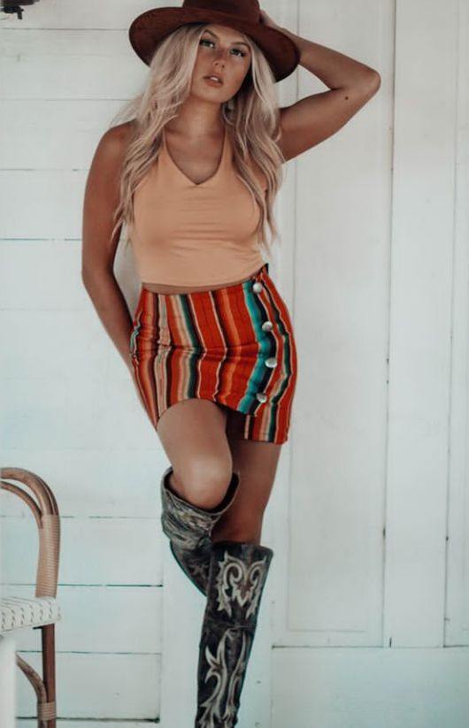 You can get a stunning cowgirl look with short skirt. Go for short leather skirt with fringes for a more glamorous look. Also put on a long boot to match. Style with the right shirt or top.