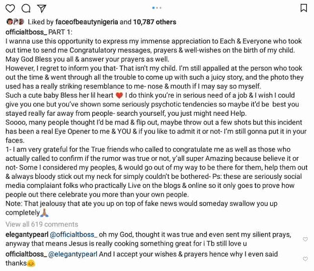 However, Tboss has debunked the rumor saying that the new born baby does not belong to her, according to her statement, ” getting pregnant, having a baby or starting a family is a personal business “.