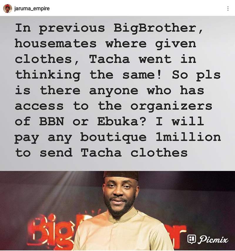 According to Jaaruma in a post which she made on her Instagram handle “ Tacha is not a Rich kid from a rich home! She is just a young girl trying to make it in life! I’m always telling you guys this. She has no one! Only God Almighty!