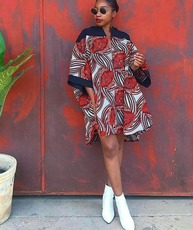 The plain fabric can either be silk, cotton, cashmere, chifon or organza while the pattern fabric can either be kente, Adire, Ankara, Kampala or any other English fabric. Plain and pattern materials can be used to achieve various styles such as Long gowns, Short gowns, trousers, skirt and blouse, jackets and jumpsuits.